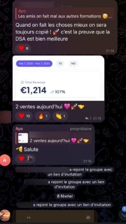 Tout ça à travers des lives sur Zoom / Des coachings one to one sur Telegram ou WhatsApp / La partie MP sur Skool et naturellement la communauté DSA.